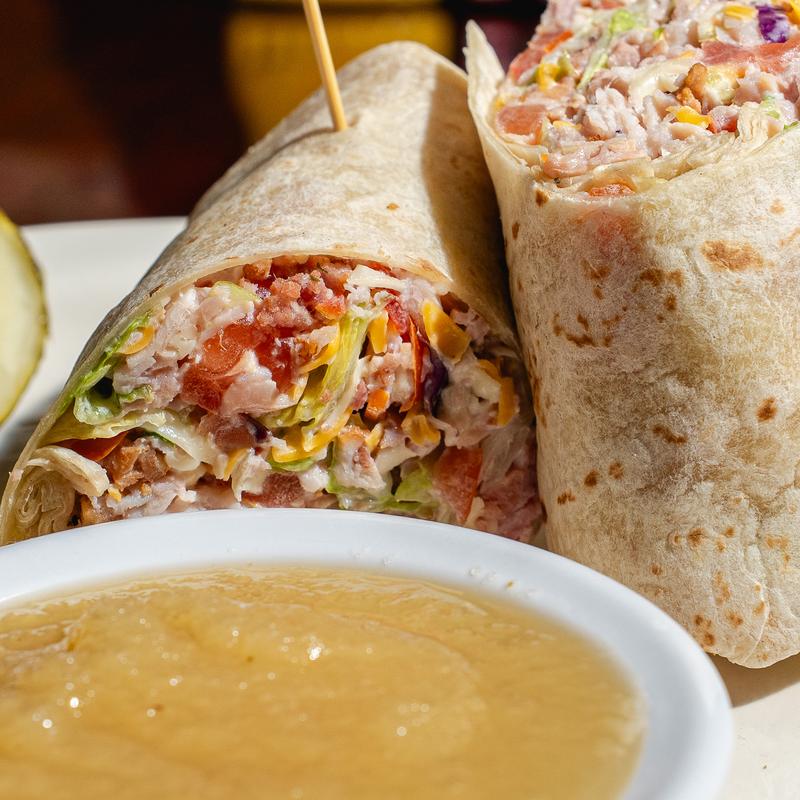 Grilled chicken, shredded cheese, lettuce, tomato, ranch dressing, and bacon bits