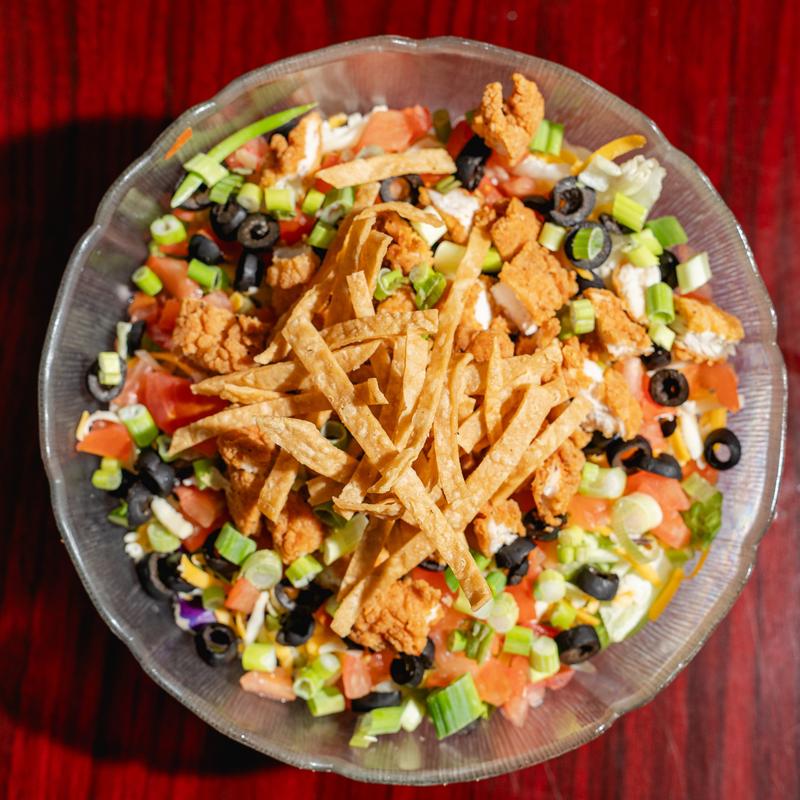 Crispy chicken, cheese, black olives, and tomatoes topped with Santa Fe dressing, green onions, and tortilla strips