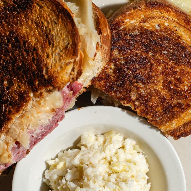 Thin-sliced corned beef, sauerkraut, Swiss cheese, and Thousand Island dressing on grilled rye bread