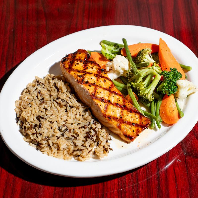 Grilled marinated pork tenderloin, red wine demi glace reduction served with wild rice and a vegetable medley