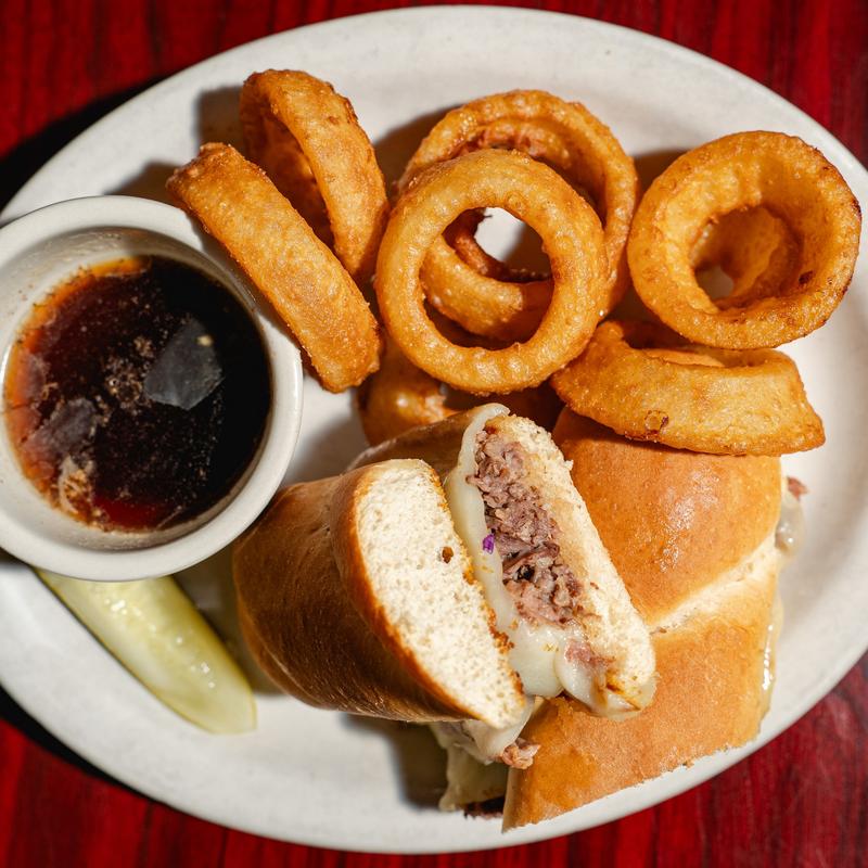 Thin-sliced prime rib served on a toasted hoagie roll with provolone cheese and au jus.
