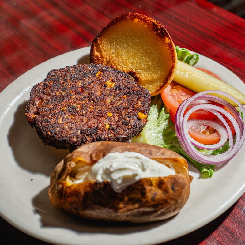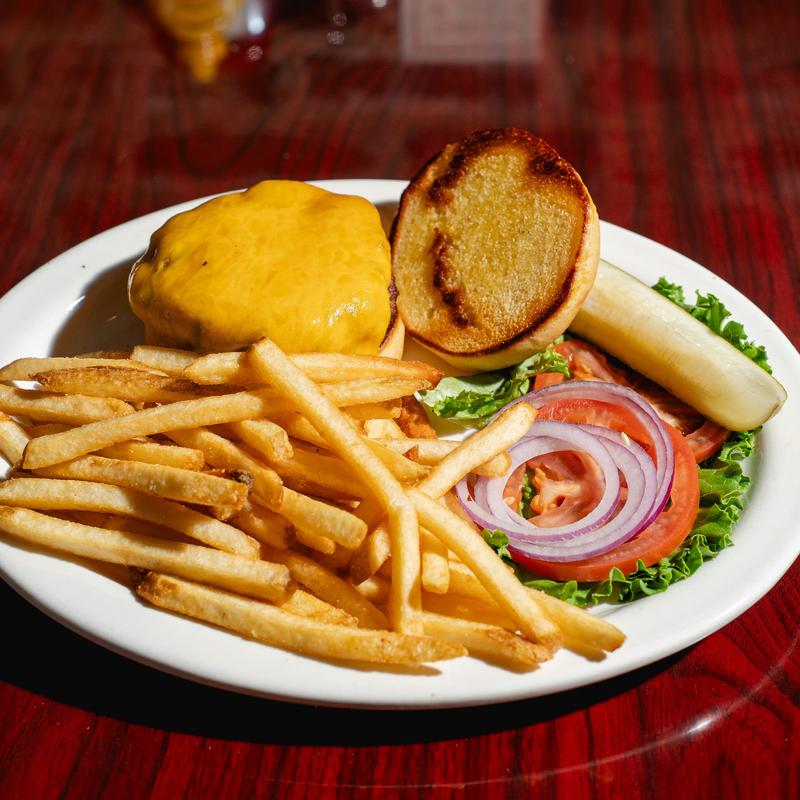 A half pound of choice 100% freshly ground lean beef served on a toasted bun with French fries, lettuce, and a pickle spear (Gluten Free bun available upon request. Sliced tomato & onion available upon request)