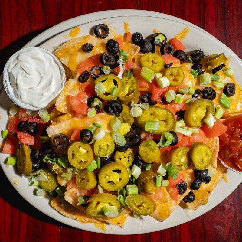 Topped with melted Cheddar & Monterey Jack cheese, jalapeños, diced tomatoes, black olives, and scallions • With Chicken | Beef
